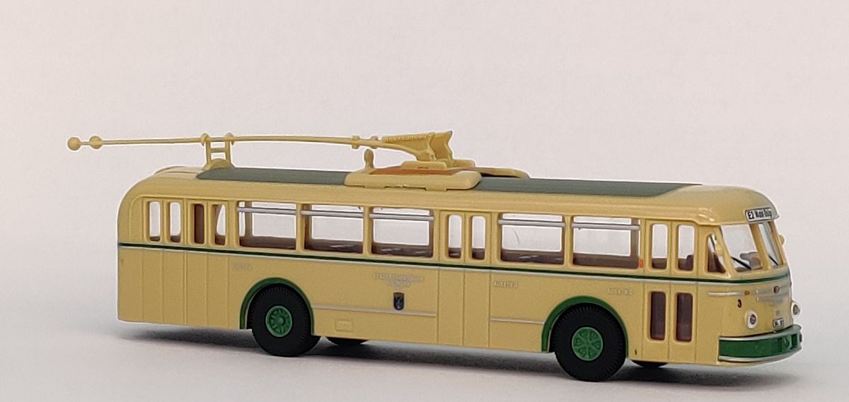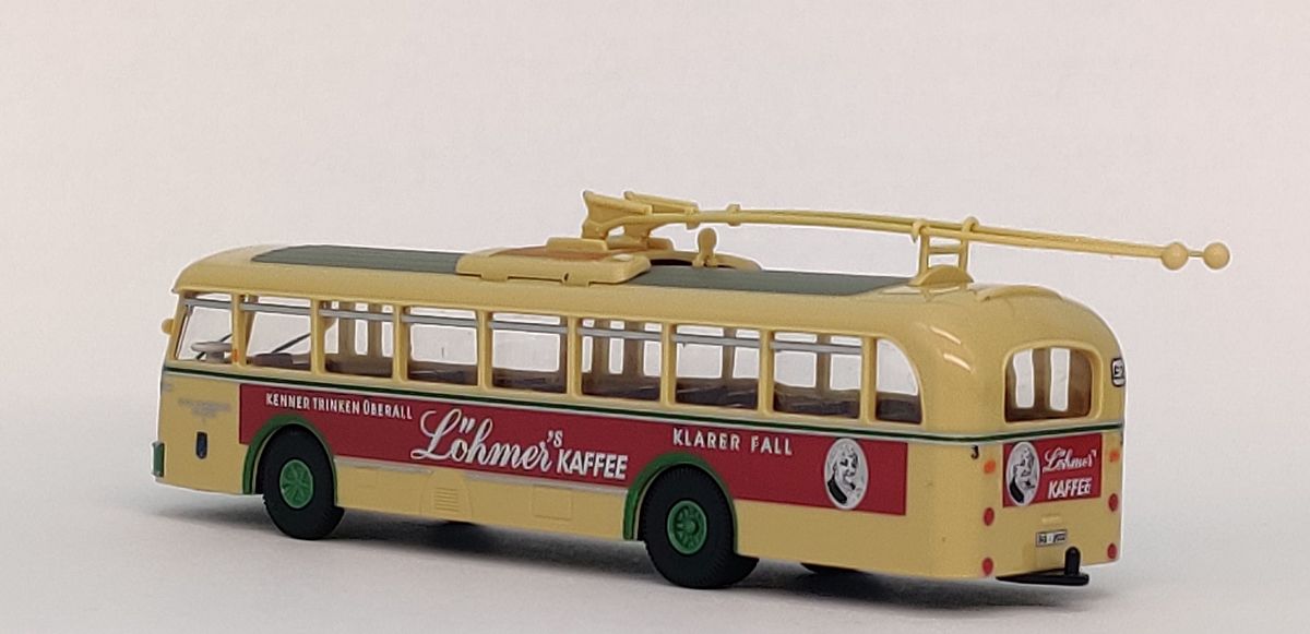 Solides Busmodell eines Trolleybusses vom Typ UeHIIIs in Ausführung des Wagens 3 der Stadtwerke Solingen mit Werbung "Kaffee Löhmer" auf Fahrerseite und Heck.