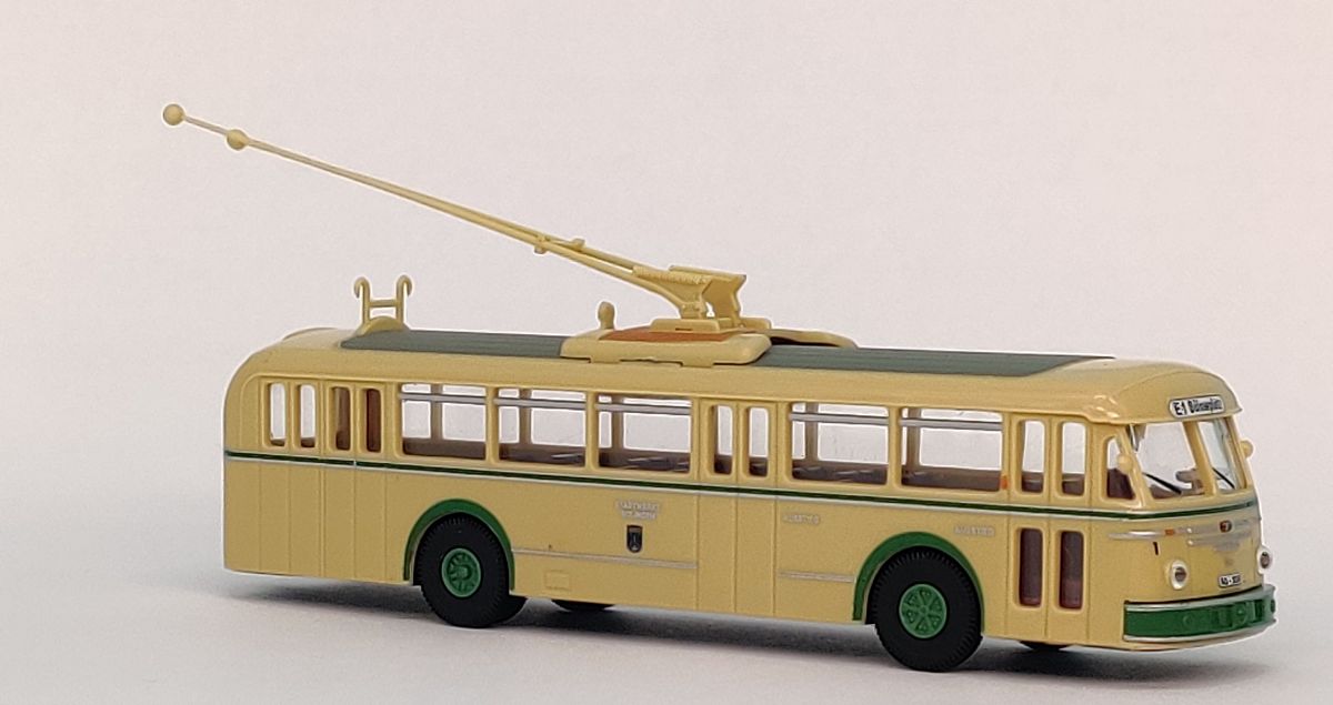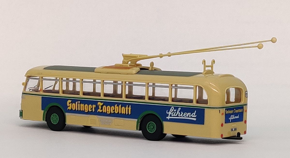 Solides Busmodell eines Trolleybusses vom Typ UeHIIIs in Ausführung des Wagens 1 der Stadtwerke Solingen mit Werbung "Tageblatt" auf Fahrerseite und Heck.